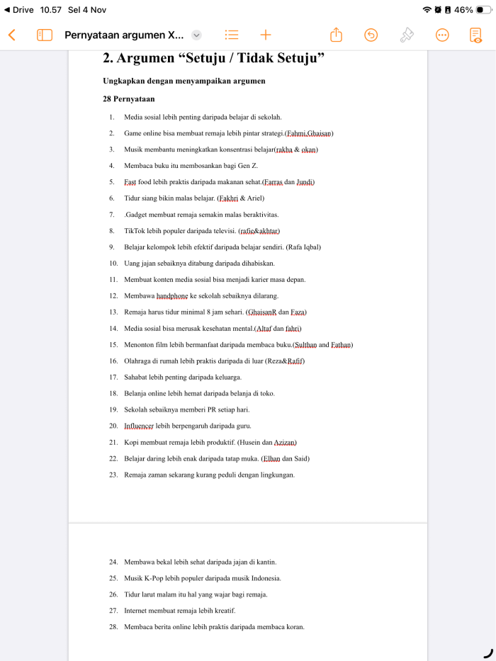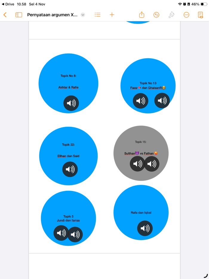 Digunakan untuk mengerjakan tugas secara kolaborasi untuk seluruh siswa selama pembelajaran berlangsung, fitur yang digunakan adalah rekam suara, dan siswa merekam argumen berdasarkan topik yang dipilih secara berpasangan, di dalam Pages tersebut terdiri dari 28 topik dengan kecepatan siswa dalam memilih “ Siapa cepat dia dapat, dan tidak bisa dipilih kembali oleh teman lainnya