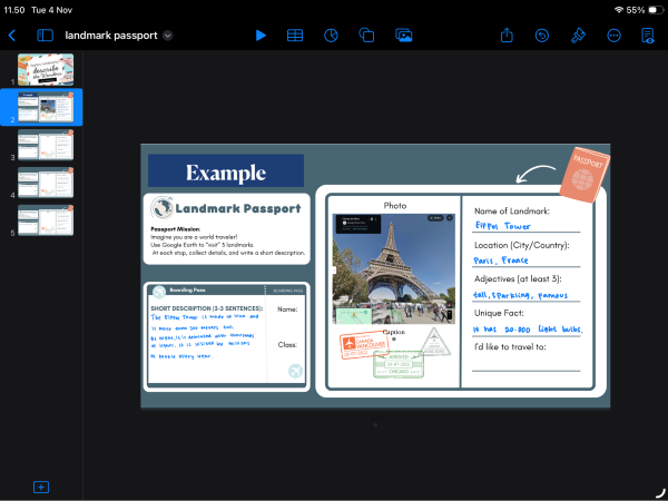 Each student documents their discoveries in a Landmark Passport designed in Keynote. For every landmark, they record: The name of the landmark, Three adjectives that describe it, One fun fact, A 2–3 sentence short description