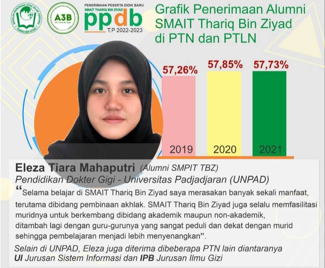 SMAIT Thariq Bin Ziyad adalah salah satu sekolah di Kabupaten Bekasi yang fokus mempersiapkan siswa-siswinya agar lulus di perguruan tinggi yang menjadi cita-cita mereka. Data menunjukkan bahwa setiap tahunnya jumlah siswa-siswi yang diterima di perguruan tinggi negeri dari SMAIT Thariq Bin Ziyad terus mengalami tren peningkatan yang signifikan baik dari jalur SNMPTN maupun SBMPTN. Data tahun 2021 menunjukkan 57,73% siswa SMAIT TBZ lulus di PTN dan PTLN, artinya 3 dari 5 orang siswa lulus PTN dan PTLN. Sedangkan siswa lainnya memilih sekolah tinggi kedinasan yang juga dimiliki oleh institusi negara seperti : IPDN, STAN, STIS, dan lain-lain.
